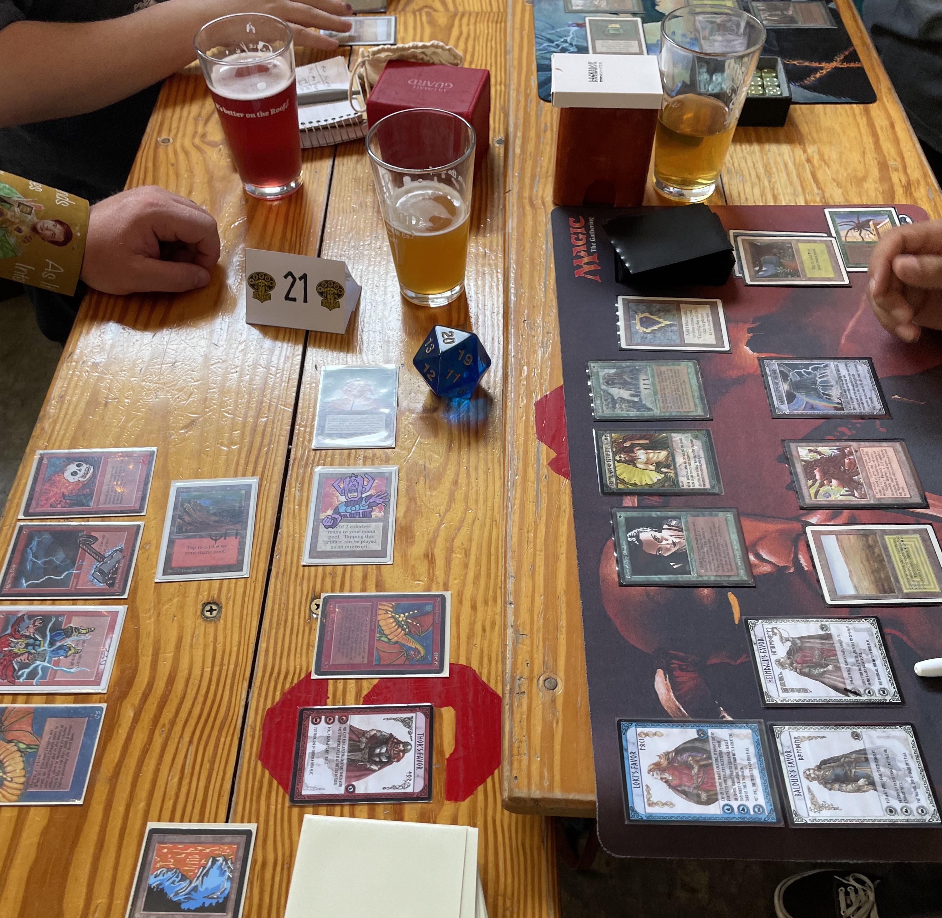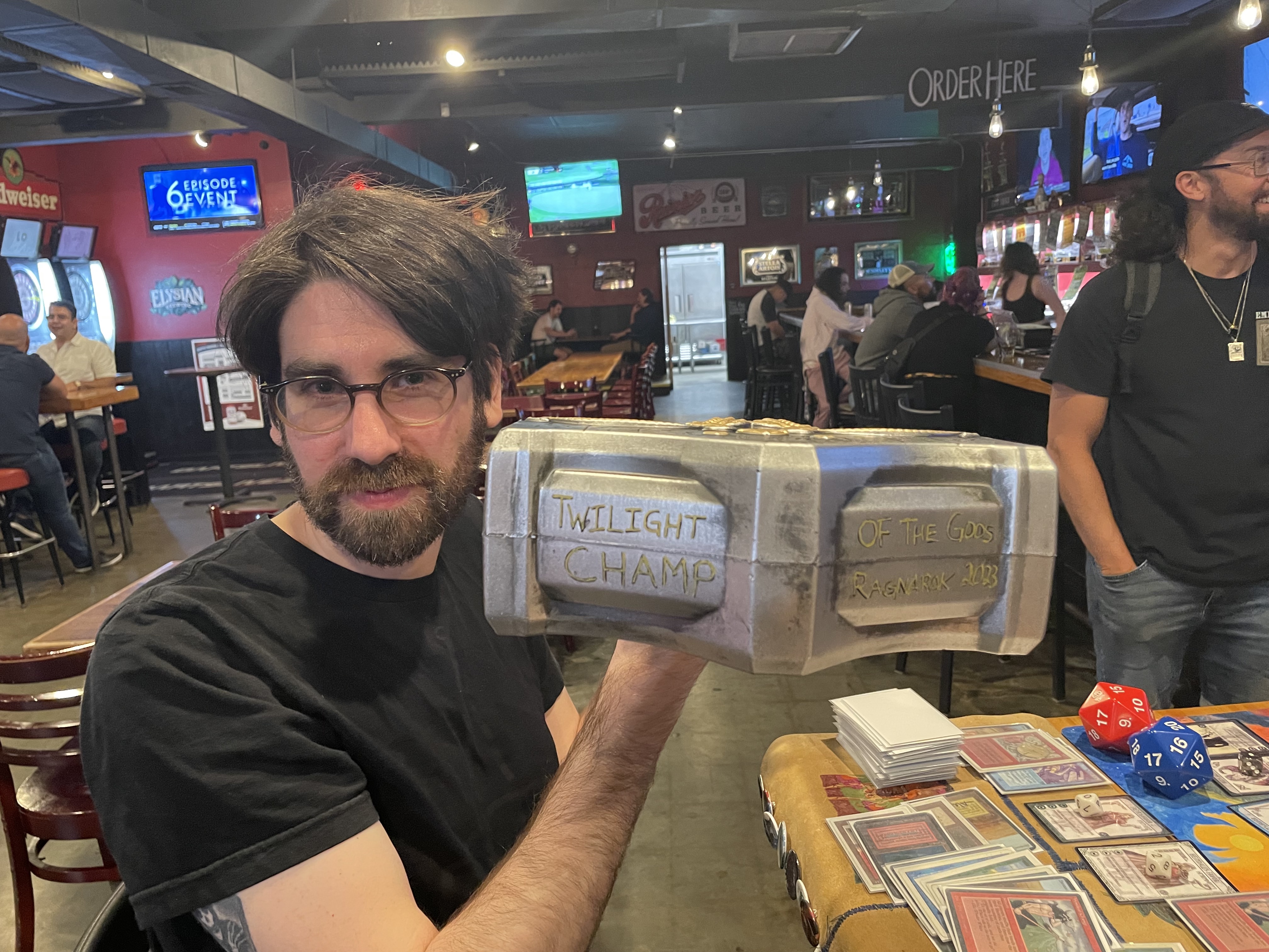 The event was held at Rooftop Brewing, a local brewery, except for the final match. When the brewery closed at 10PM, we had only completed 5 rounds of Swiss, so the two finalists, Danny Friedman (Heimdall combo) and Brian Bogdan (UB reanimator) went to one of my favorite local dives, the Lamplighter Pub, to play the championship match. Danny ended up taking it down, winning Mjolnir as a trophy in the process. Incidentally, Mjolnir has a special in-game ability: from now on, at any tournament I run, if Danny would flip a Chaos Orb, he may instead say "For Asgard!" and hit the chosen card with Mjolnir instead. He has to use the actual (foam rubber) Mjolnir trophy he was presented to do this, so if you see him carrying around a huge hammer at my next event, that's what it's about.