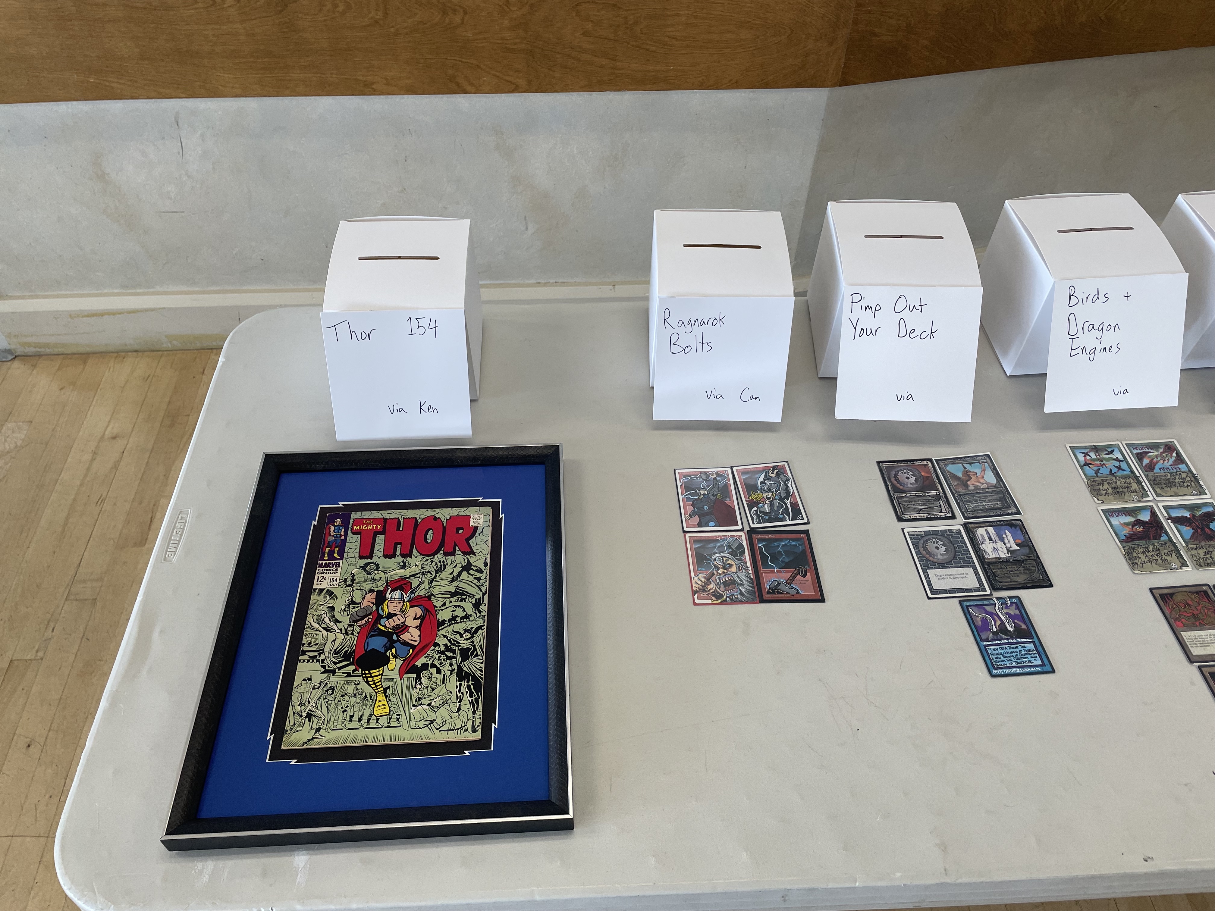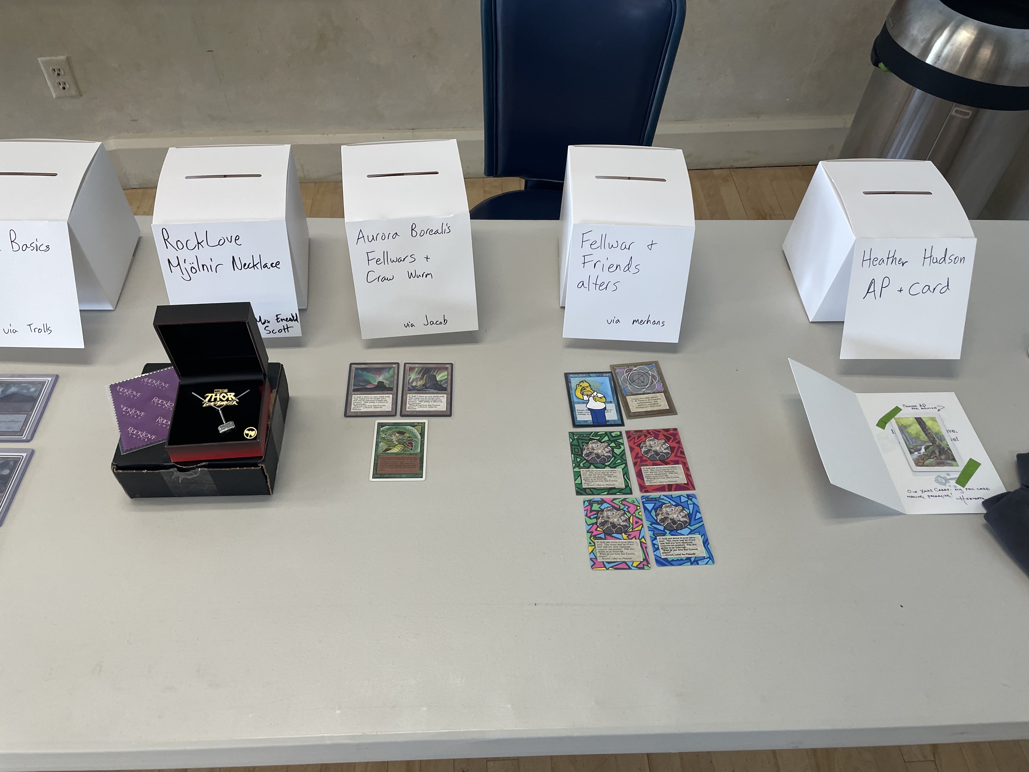 The tournament also included a raffle for a wide variety of prizes donated from the community, as well as several pieces donated by the artists. Finally, we auctioned off an original piece by Jesper, original Mjolnir necklace made by Nicola, and the original art for the event playmat from Mark Tedin. All of these helped make major contributions to the charity pot for Mary's Place.